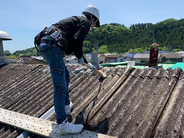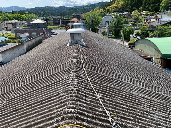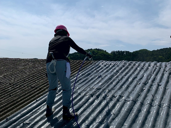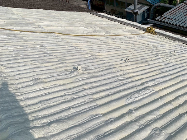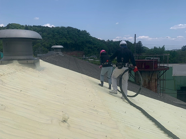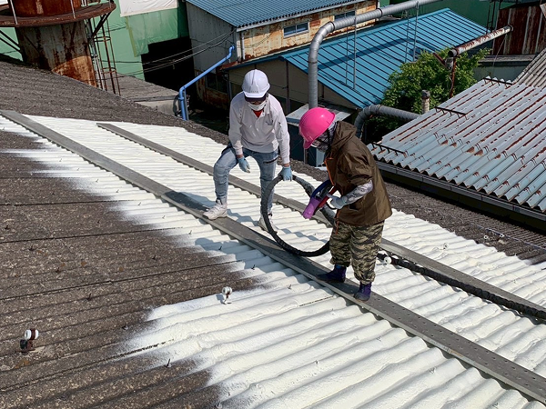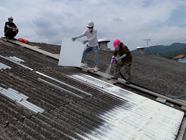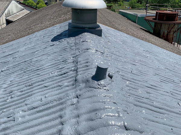 長期間風雨や太陽光に晒された屋根は少しの重みでも割れて抜ける恐れがあったが、下地にウレタンを吹き付ける事により安全かつスムーズに施工。ポリウレアを足元から吹き付ける事で安心して屋根の上に乗る事ができます。