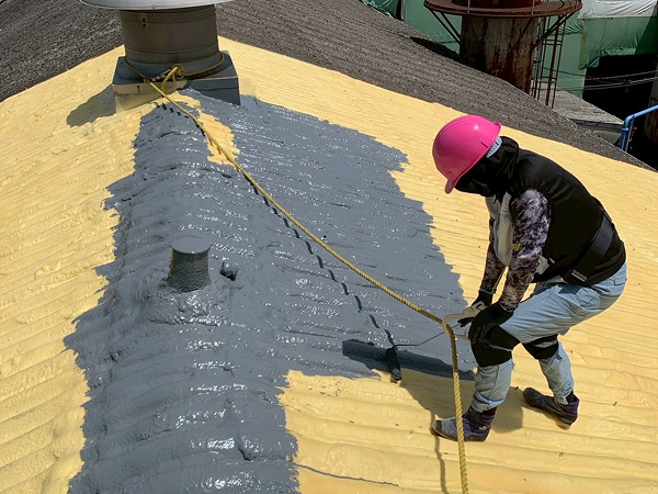 老朽化した工場の屋根の雨漏り対策と強化を目的としたポリウレア施工。