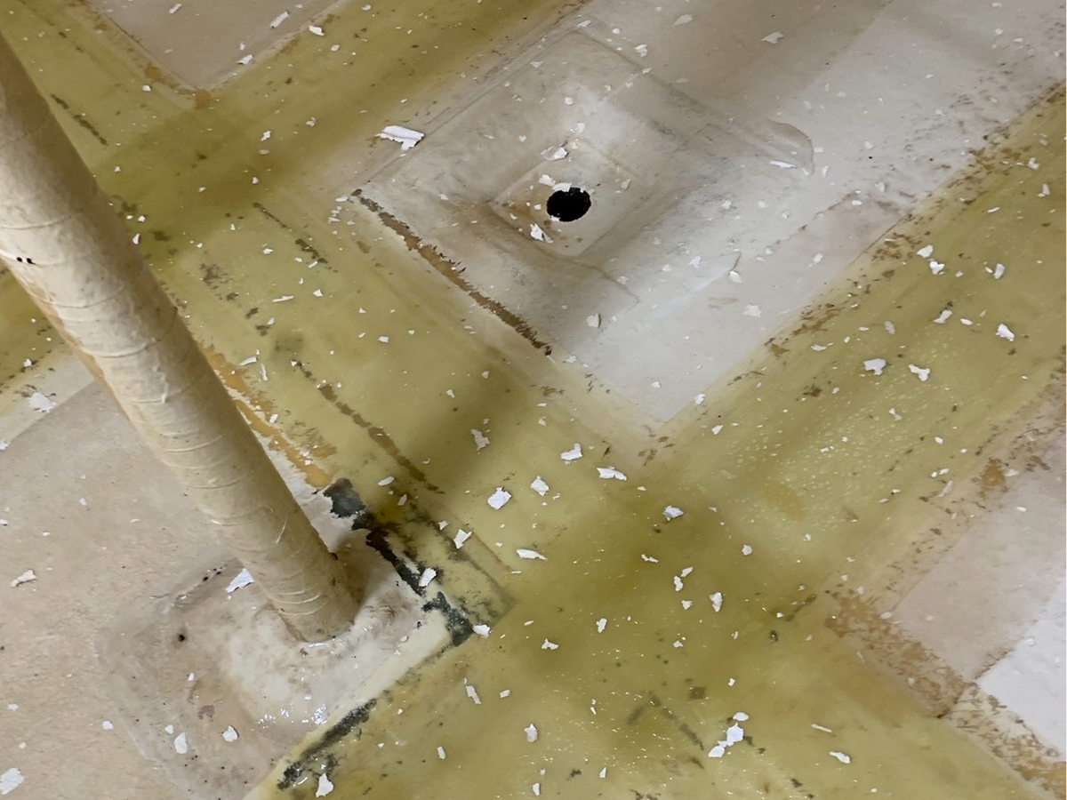 貯水タンク内の何処かに亀裂または破損が考えられるため完全に水抜きし清掃を行ったところ、古くなったFRPが溶けてしまっており全体的に脆くなっていることを確認。